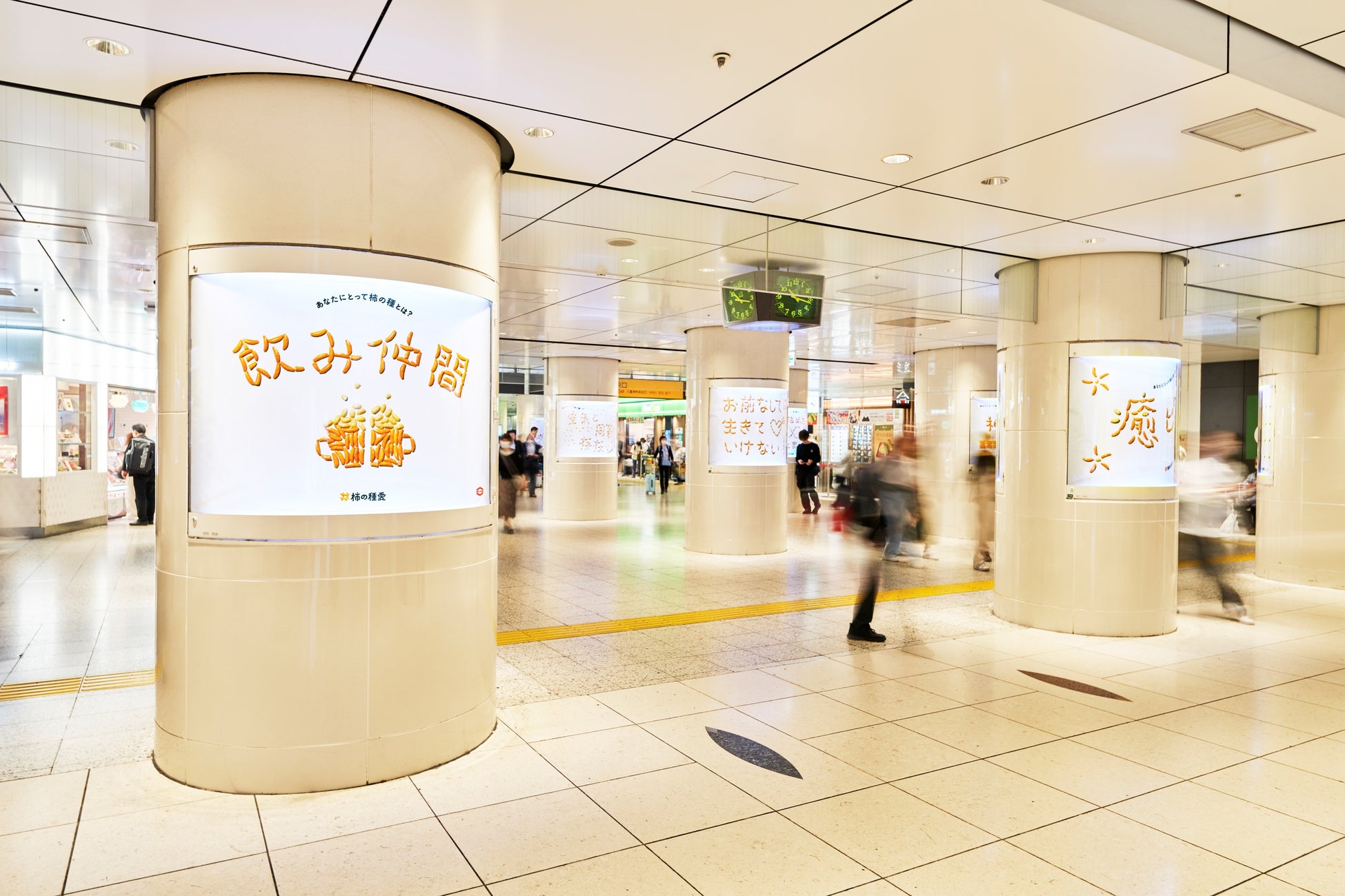 東京駅八重洲北口・中央口・南口、のぞみ広場など合計5箇所に『亀田の柿の種』への愛を表現したメッセージ広告が出現します。八重洲北口と南口は「IカリッとYOU.」をテーマにしたダイナミックな柱巻き広告が登場。八重洲中央口とのぞみ広場では、お客様からの愛を可視化した広告を掲載します。X(旧Twitter)でお客様から実際に募集した「あなたにとって柿の種とは?」のメッセージを柿の種で作り、ポスターやコマ撮り動画にしています。亀田の柿の種のイメージキャラクターを務める賀来賢人さんも柿の種アートで「柿賢人(かきけんと)さん」に変化しています。広告掲載期間は10月27日(日)までです。