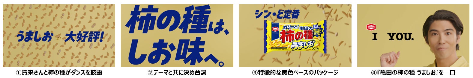 「亀田の柿の種の日」に合わせて、今年の3月に放映して多くの反響をいただいた、俳優賀来賢人さんが出演するCM「IカリッとYOU うましお篇」 「IカリッとYOU ダンス&うましお篇」も再放送します。CM本編は、『亀田の柿の種 うましお』のテーマカラーである黄色い衣装を着用した賀来さんが小さな柿の種の下から登場し、シン・ど定番の誕生というビッグニュースを声高らかにお伝えするコミカルな内容となっています。