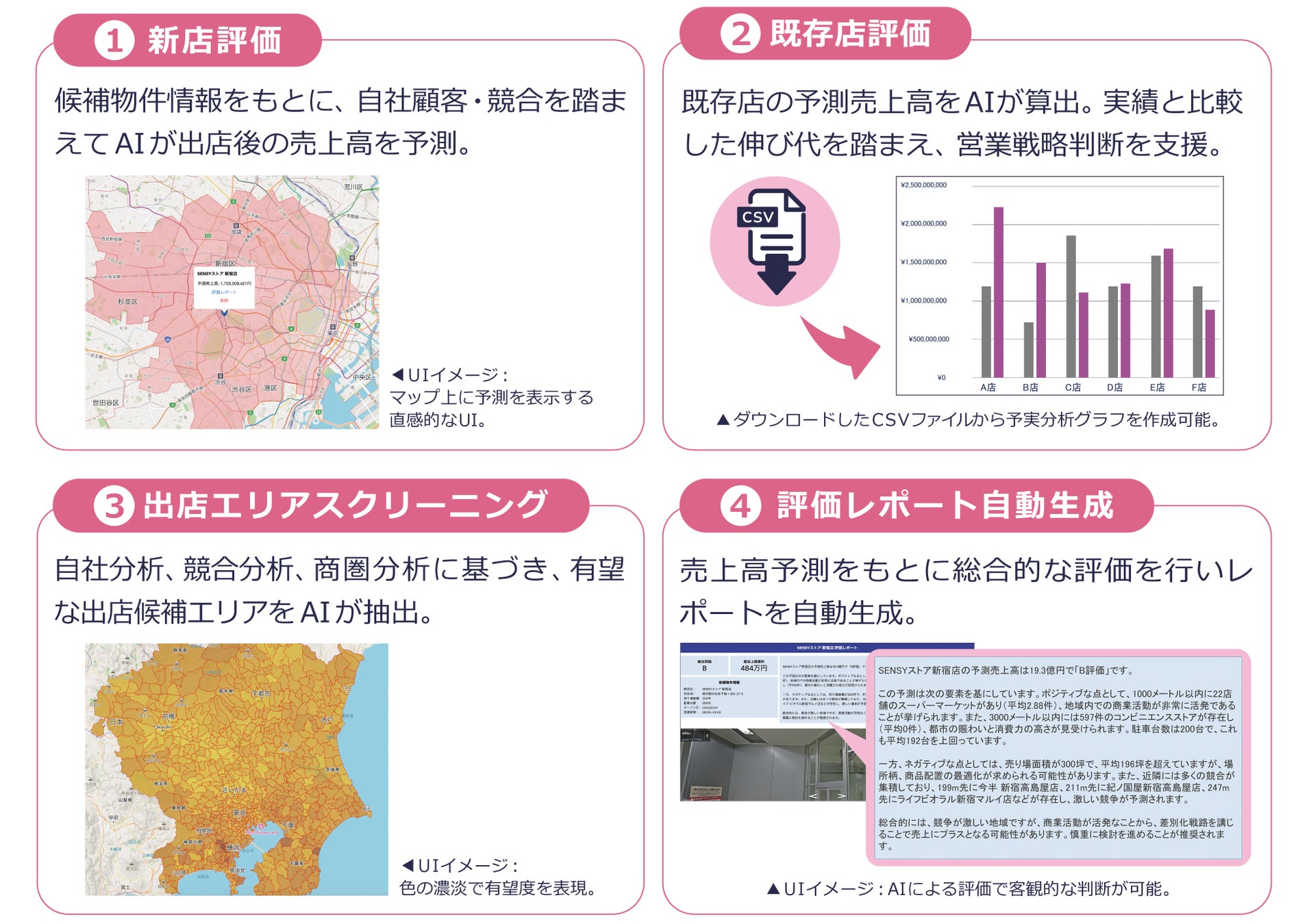 店舗分析DXサービス「SENSY GeoScope」は店舗開発におけるロスを無くすことをコンセプトに開発した次世代の店舗分析ツールです。地図上でピンを打つだけで予測準備が完了するなどWEBUI上での直感的操作が可能であり、出店・改装・閉店に関する、より高度な意思決定をサポートします。