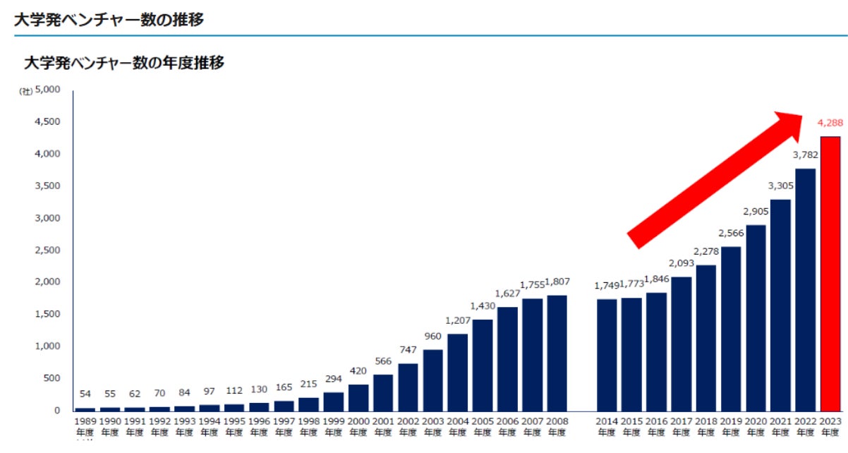 『スタートアップ5か年計画』を受けて、最先端の大学研究や科学技術などを活かして起業する大学発スタートアップ(大学発ベンチャー)企業数は、急増しています。