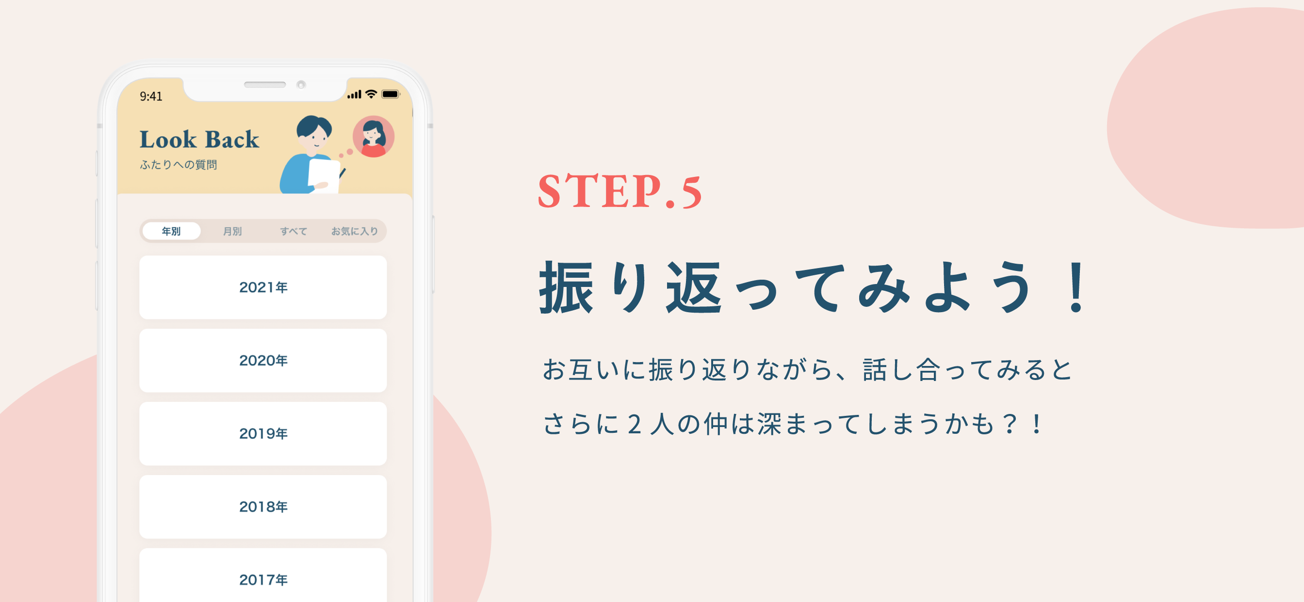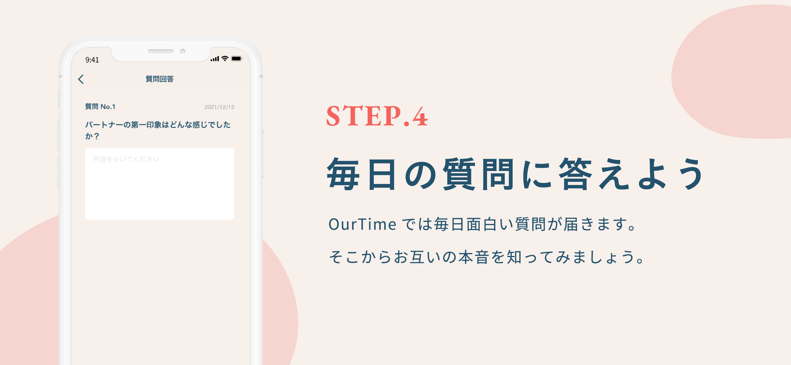 - 【ふたりへの質問】:OurTimeでは毎日1問、質問が届きます。普段聞きづらいことや、自分では聞くことがない様な質問があなたの元に届きますので、お互いの理解を助けます。