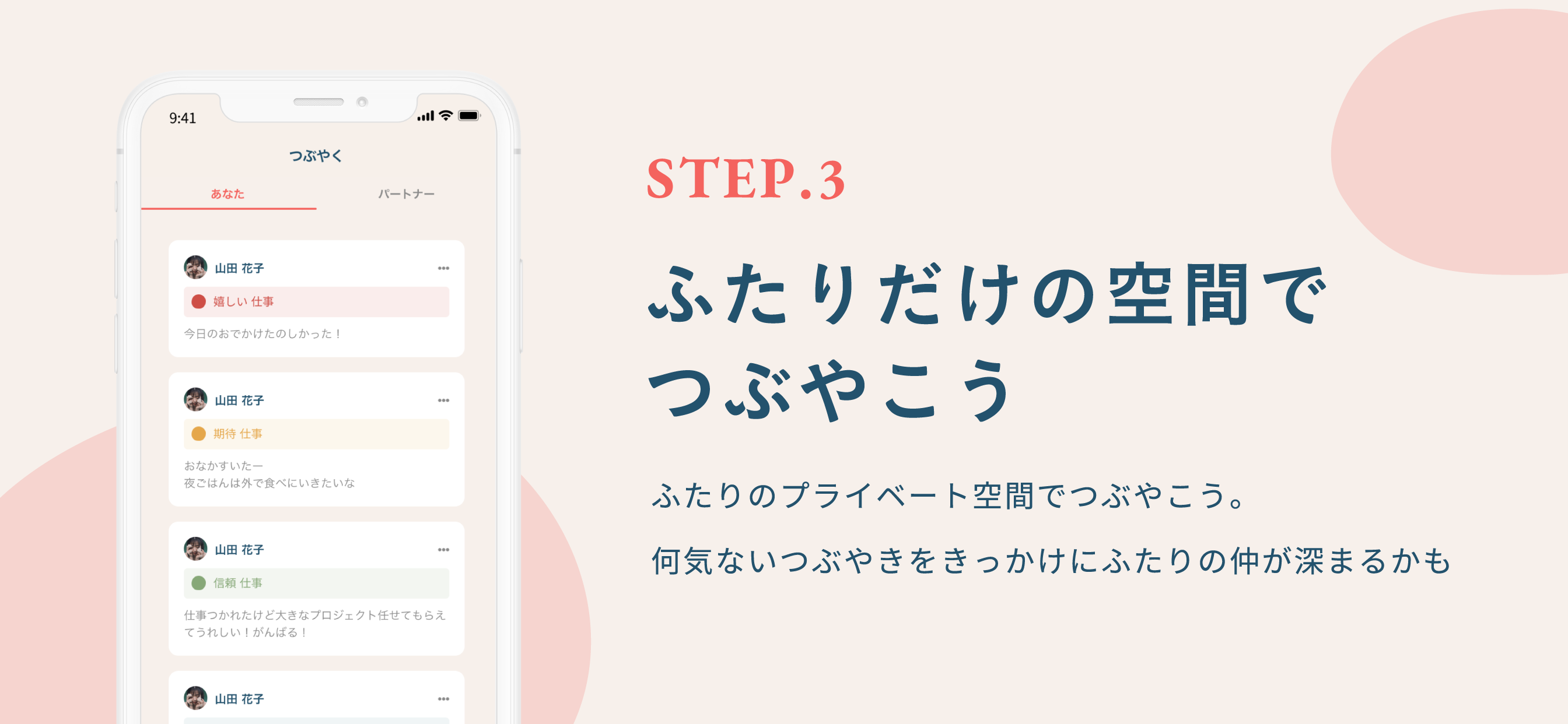 - 【つぶやき】:ふたりだけのプライベート空間でつぶやくことができます。つぶやくことで、お互いの何気ない日常や気持ちをのぞくことができ、何気ない発見があります。