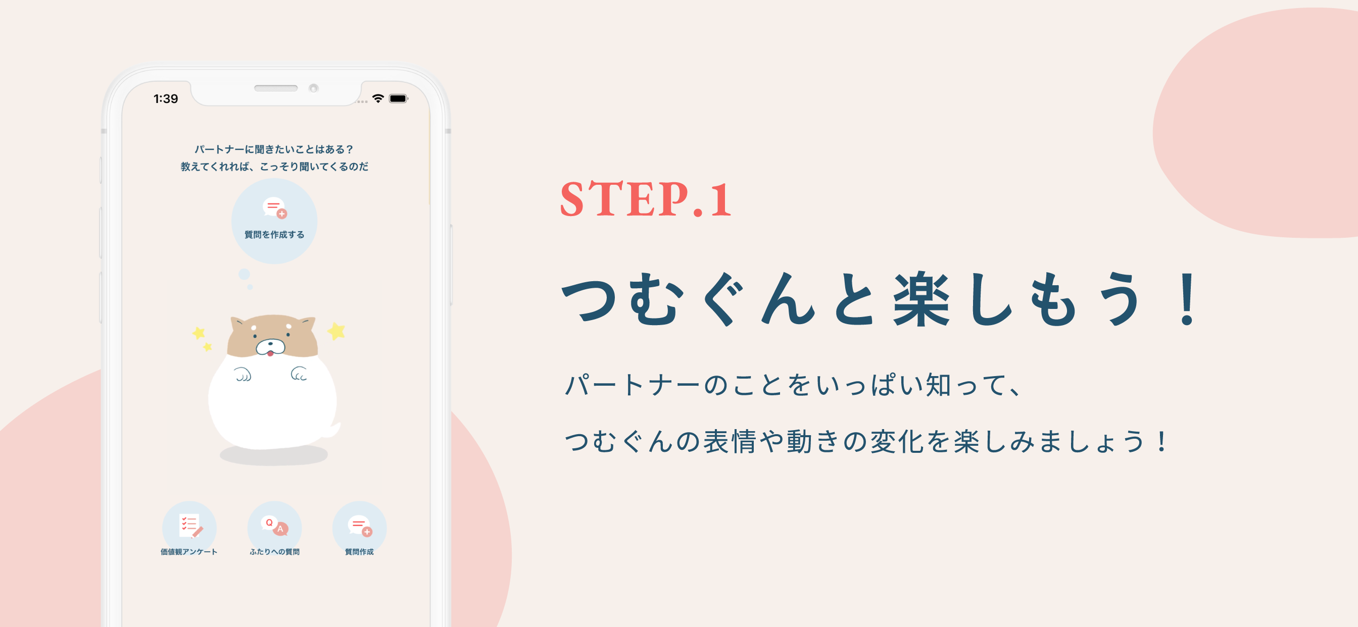 - 【つむぐん】:OurTimeではつむぐんという、あなたとパートナーの物語を見守ってくれるペットがいます。ただ質問に回答するだけの単調なアクションで終わらず、つむぐんの色々な表情を楽しんでもらえます。
