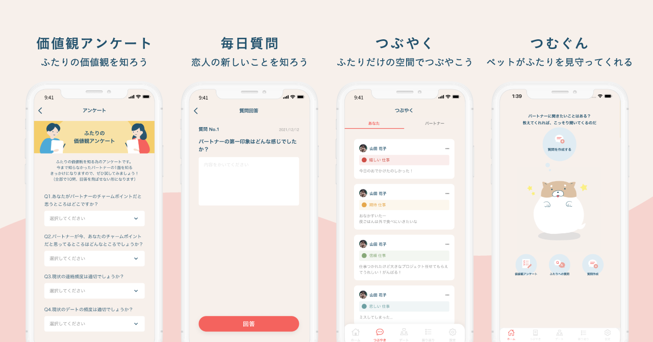 カップル同士のスケジューリングや記念日アプリは多くありますが、実際にお互いの理解を深めるためのカップル向けエンゲージメントアプリは国内初めてのものです。