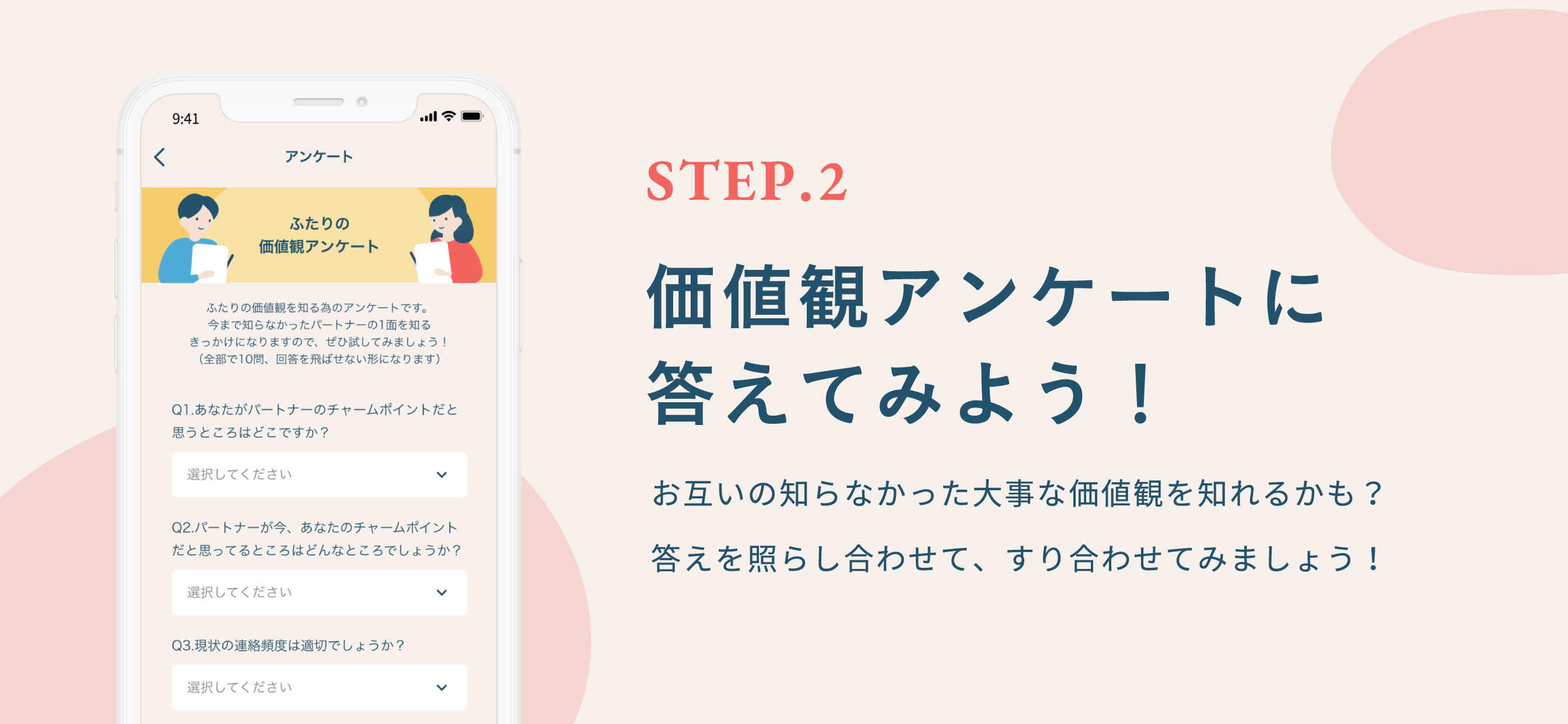 - 【ふたりの価値観アンケート】:価値観アンケートでは、簡単なアンケートに答えることによって、お互いの考え方や価値観を可視化することができます。また、すり合わせを行うことにより、お互いの価値観を尊重する様になり、パートナーとの良好な関係が築けます。