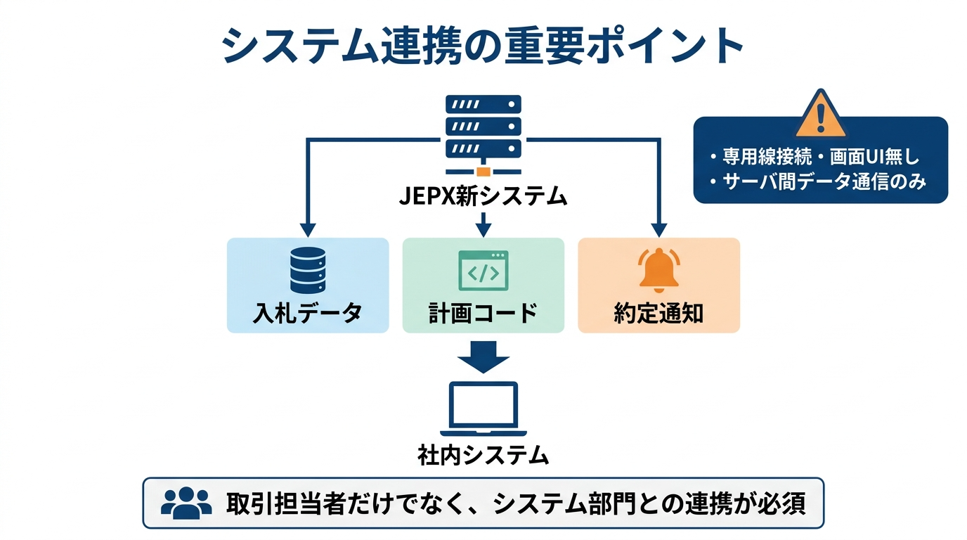 もう1つの注意点は、社内システム対応です。JEPXは連係システム説明会の案内で、新システムは専用線を利用したサーバ間データ通信で機能を提供し、画面の提供はないと説明しています。そのため今回の変更は、取引担当者だけで完結する話ではありません。入札データ、計画コード、約定通知をどのように社内システムへ連携するか。BESS NEWSでは、こうした実務面の確認ポイントまで踏み込んでいます。