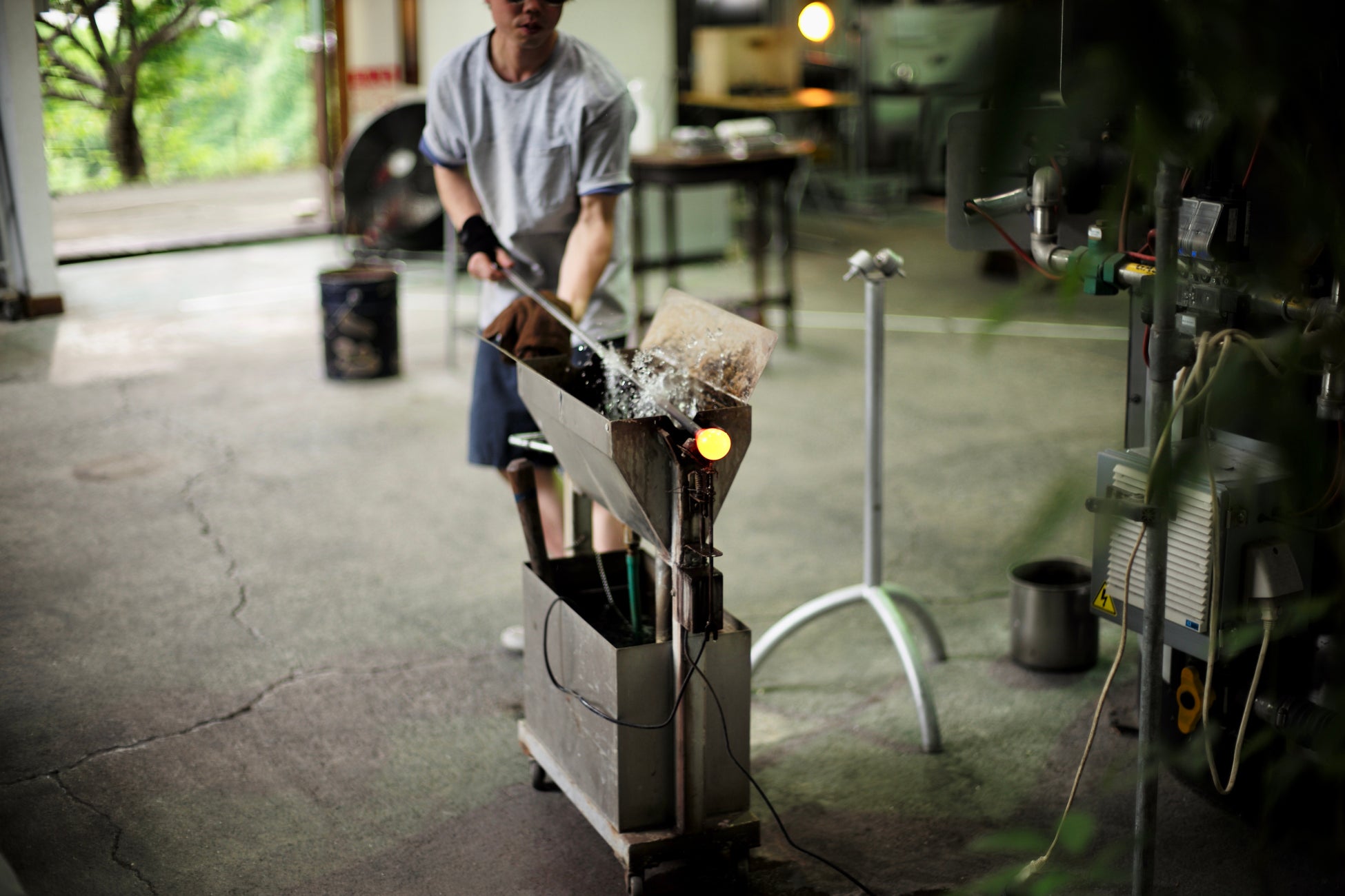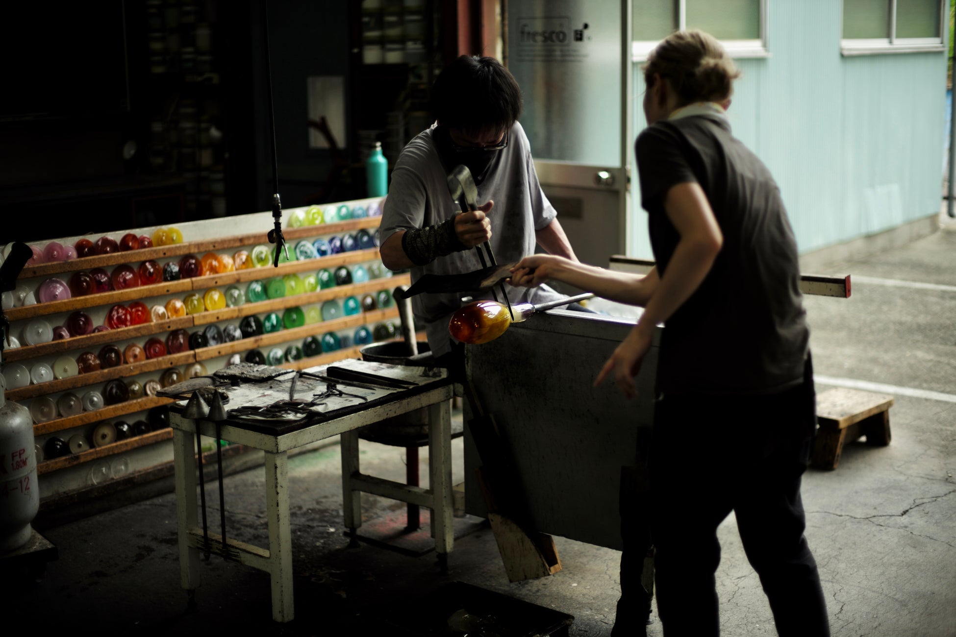 工房内では、基本的に二人一組、それぞれのチームが釜ガラスの溶解炉から溶けたガラスを巻き取り、下玉と呼ばれる小さな玉を作るところから、息を吹き込み成形、何度も窯と作業ベンチを行き来しながら、仕上げまでの全工程を行います。