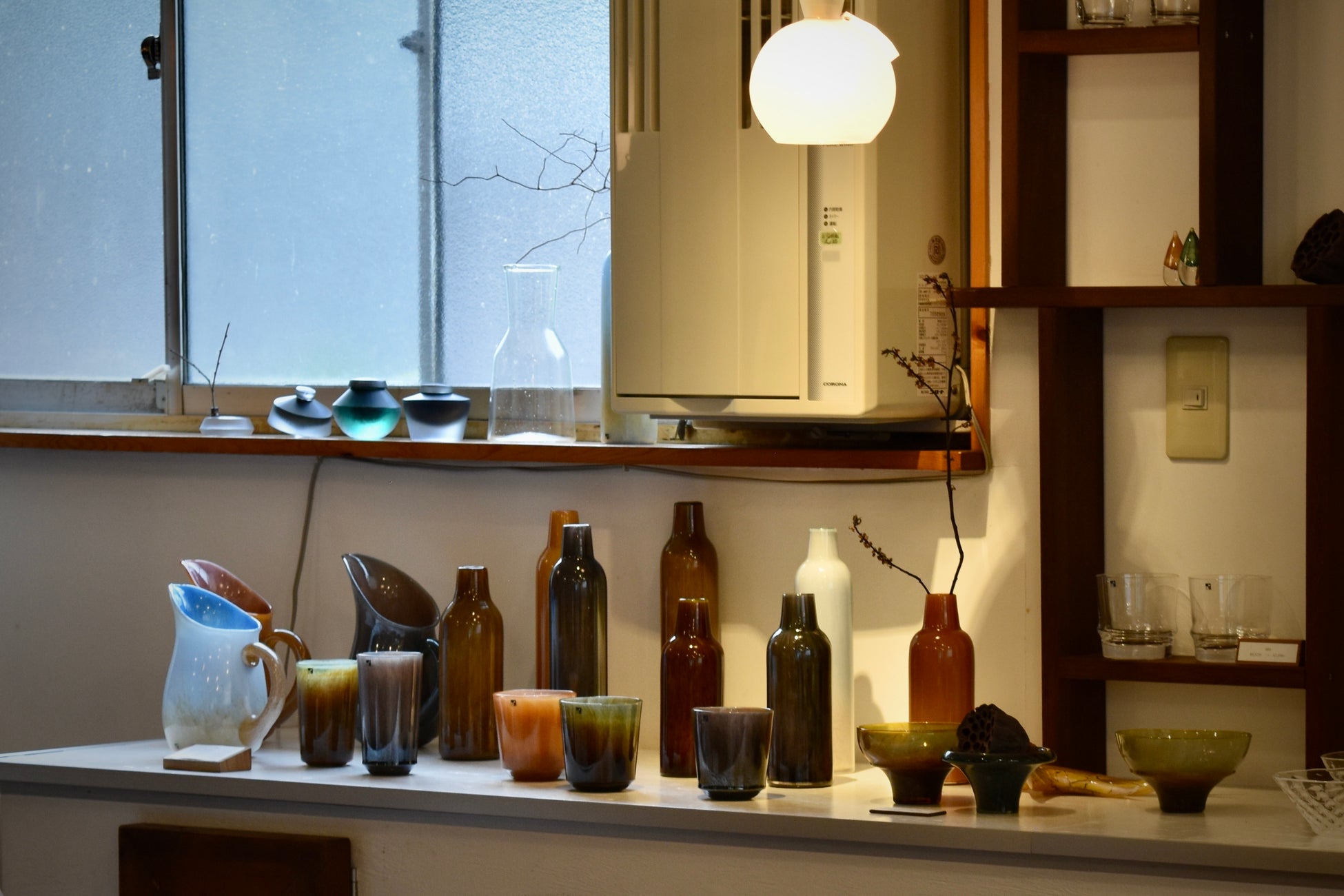 吹きガラスの技法を用いた、一つ一つ手作りの器。主にパウダー状の色ガラスの重なりで多様な表情や色を表現した製品が特徴的です。