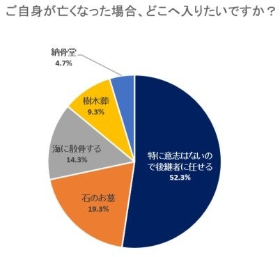 ”特に意志はないので後継者に任せる”52.3%で半数以上を占め、”石のお墓”19.3%、”海に散骨する”14.3%、”樹木葬”9.3%、”納骨堂”4.7%と続く。