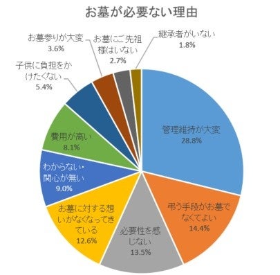 “お墓は必要だと思わない”と回答した人の理由は、”管理維持が大変”28.8%、”弔う手段がお墓でなくてよい”14.4%、”必要性を感じない”13.5%、”お墓に対する想いがなくなってきている”12.6%と続く。