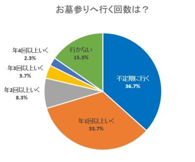 48.0%の人が年に1回以上お墓参りへ行き、36.7%が不定期にお墓参りへ行くと回答し、計84.7%の人が何らかの形でお墓参りへ行くことがわかった。