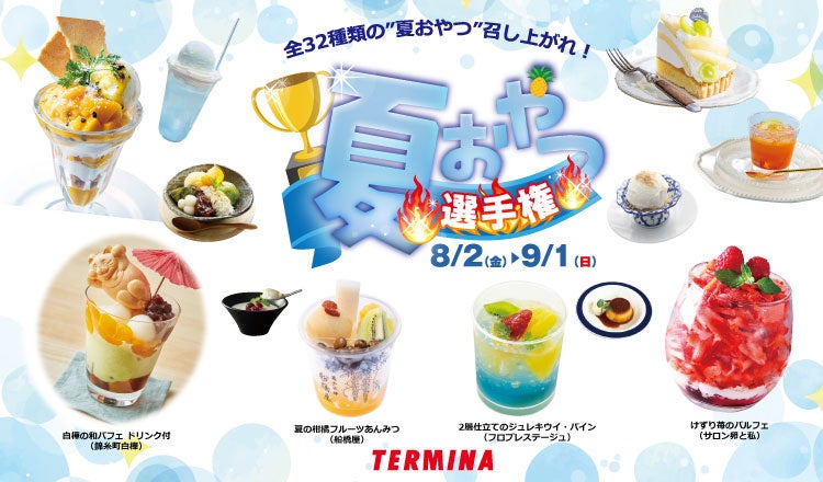 猛暑が報じられる今夏、8月2日(金)が 「おやつの日(一般社団法人日本おやつ協会制定)」でもあることから、「ひんやり夏おやつ」をテーマに「テルミナ」館内各店がバラエティ豊かな全32種の「夏おやつ」をご提供します。