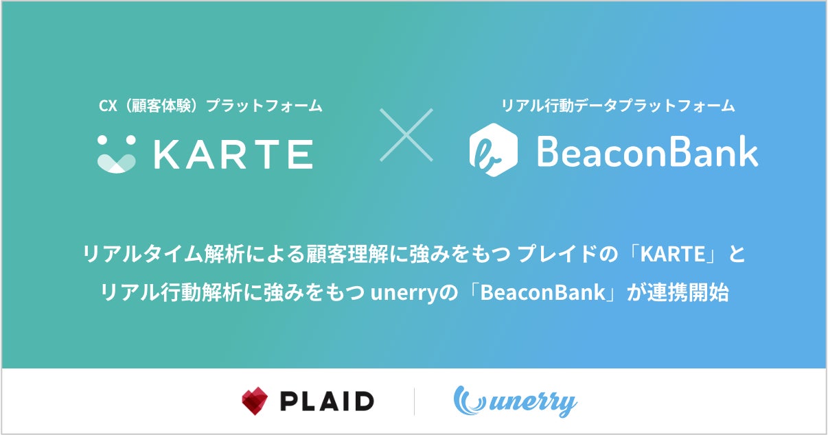 株式会社プレイド(東京都中央区:代表取締役CEO 倉橋健太)が提供する CX(顧客体験)プラットフォーム「KARTE」(以下、KARTE)と、株式会社unerry(東京都港区:代表取締役CEO 内山英俊)の運営する日本最大級のリアル行動データプラットフォーム「Beacon Bank®️」(以下、Beacon Bank)は、プロダクト連携を開始しました。