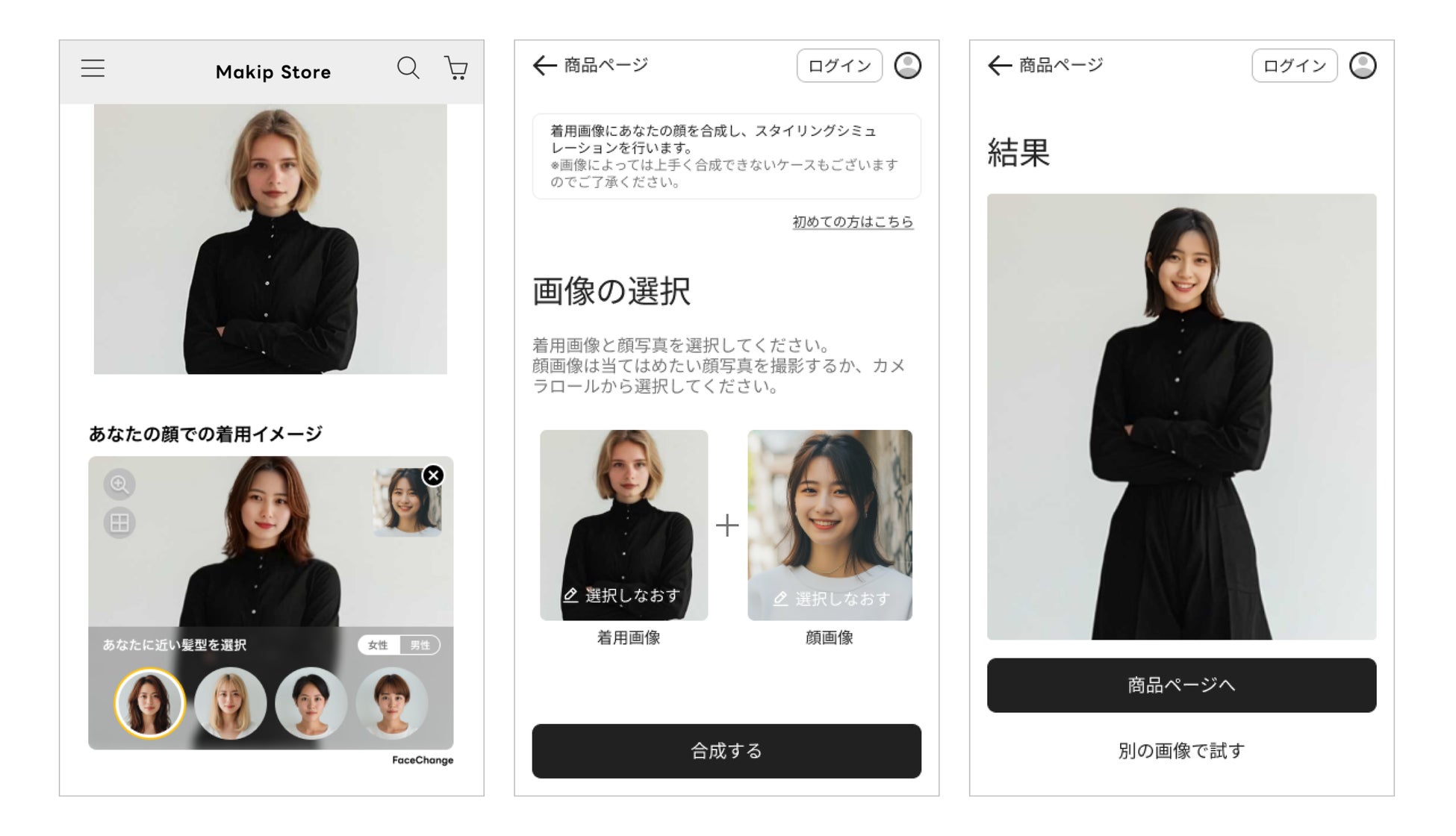 株式会社メイキップ(東京都新宿区、代表取締役:柄本 真吾、以下「メイキップ」)は、顔合成AI「FaceChange(フェイスチェンジ)」(特許出願中)の着用モデル変更機能に、新たに男性ラインナップを追加しました。男性ラインナップの追加により、男性ユーザーも自身の髪型や雰囲気に近いモデルの顔に差し替えて、着用イメージを確認できるようになります。本サービス導入の結果、利用者の購買率は非利用者と比較し1.4倍以上に向上いたしました。今後もFaceChangeのさらなるアップデートを通じて、オンライン上で「自分に似合うかを、より手軽にかつ高精度に確認できる体験」を提供してまいります。