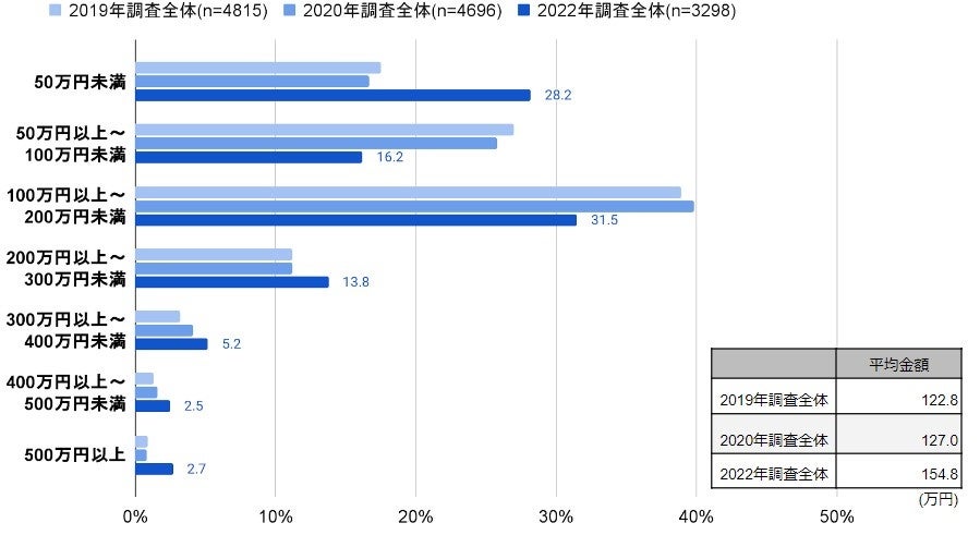 「50万円未満」割合が大幅増加し、「50万円以上~100万円未満」の割合が減少。また「200万円以上~」の割合は増加傾向であり、かつ二極化傾向。