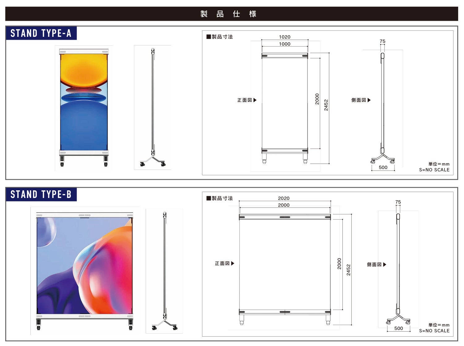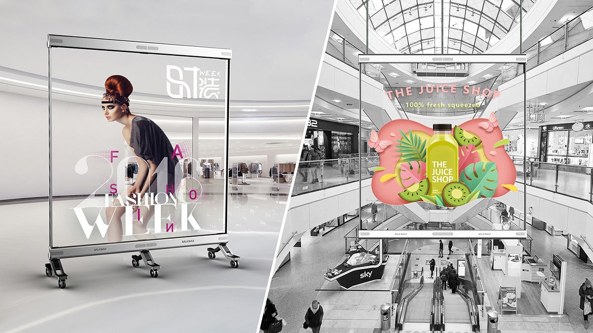 80%の高い透過率と、薄さ・軽さ・明るさを兼ね備えた高透明度LEDビジョンのパッケージモデルです。組立不要で、スタンド式、天吊りなど、多彩な設置方法が自由に選択できます。