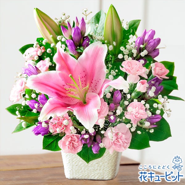 NO.3は、華やかな大輪のピンクユリに、ふんわりとしたカスミソウをあしらったアレンジメントです。秋の花・りんどうを添えて、上品で落ち着いた雰囲気をプラスしています。