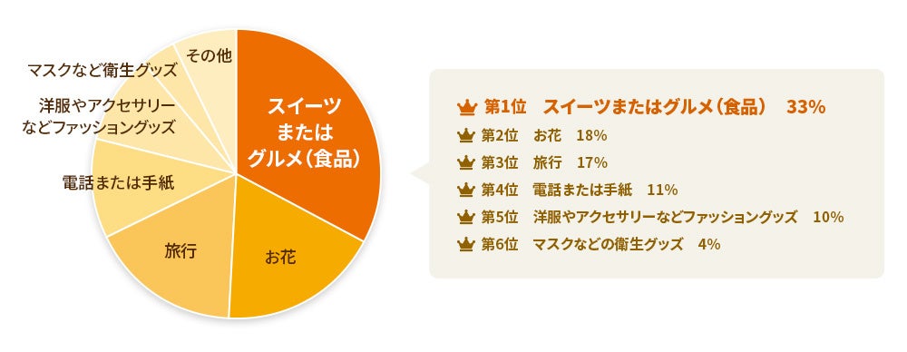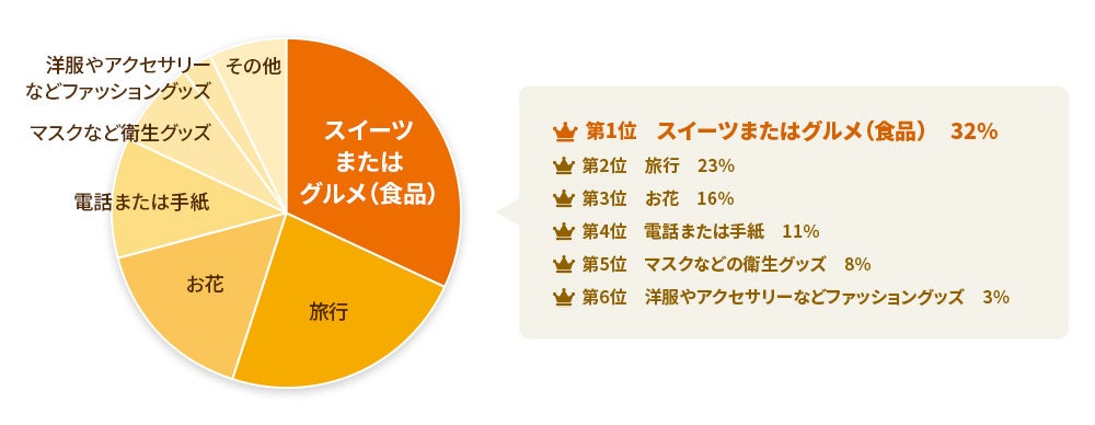 今までもらって嬉しかったプレゼントと比較すると、外出の規制がなくなったせいか旅行の割合が6ポイント多くなっています。また「マスクなどの衛生グッズ」が「洋服やアクセサリーなどのファッショングッズ」を上回っています。