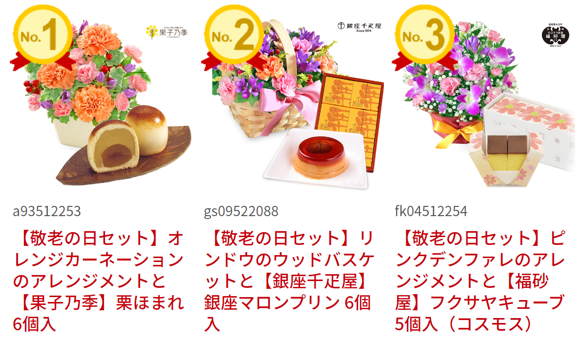 敬老の日の花とスイーツのセットギフト商品ランキングは以下のとおりです。