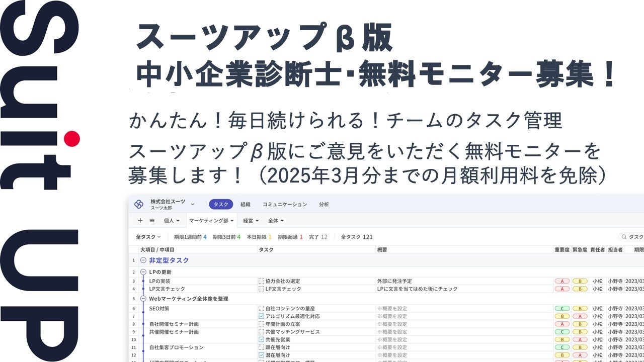 株式会社スーツ(所在地:東京都千代田区、代表取締役社長CEO:小松 裕介)は、チームでかんたん、毎日続けられるプロジェクト・タスク管理ツールの経営支援クラウド「Suit UP」(スーツアップ)の中小企業診断士の無料モニターを募集いたします。