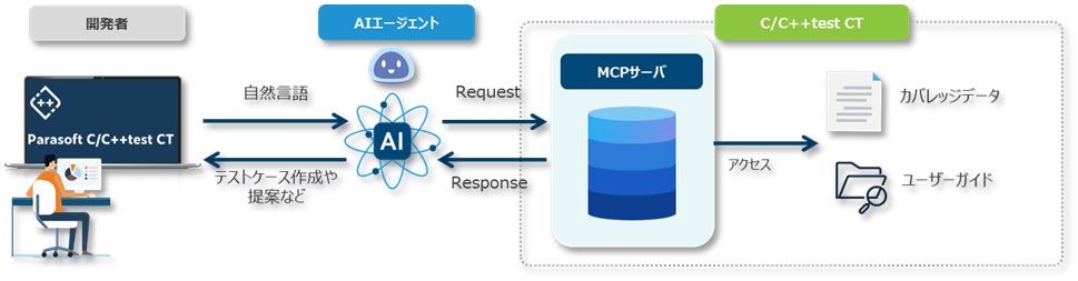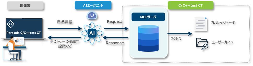 C/C++test CTはMCPサーバーを標準搭載しています。MCPサーバーはAIエージェントが外部のシステムやデータにアクセスできるよう「ブリッジ」の役割となる仕組みです。