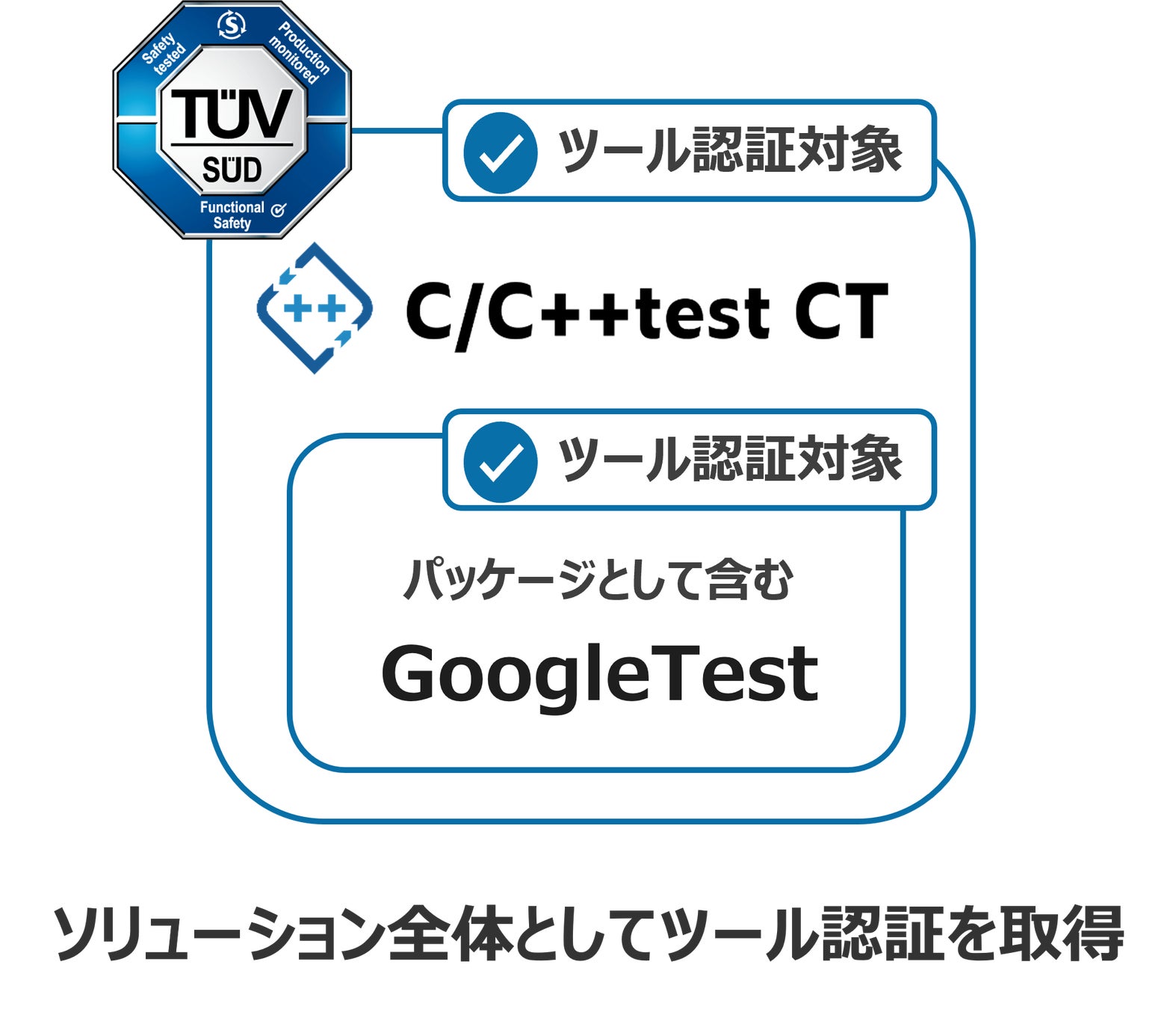 C/C++test CTはツール認証取得済みのGoogleTestをパッケージとして含み、ソリューション全体として第三者認証機関であるTÜV SÜD社よりツール認証を取得しています。