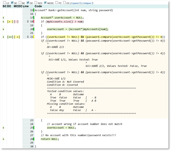 判断文カバレッジ、単純条件カバレッジ、MC/DCカバレッジにおいては、インラインコメントを展開してヒントを表示することができます。どの条件値がテストされたか、テストされていない条件をカバーするためにどの条件を満たす必要があるかを提示します。また、複雑なMC/DCカバレッジの最小論理組み合わせの理解にも役立ちます。