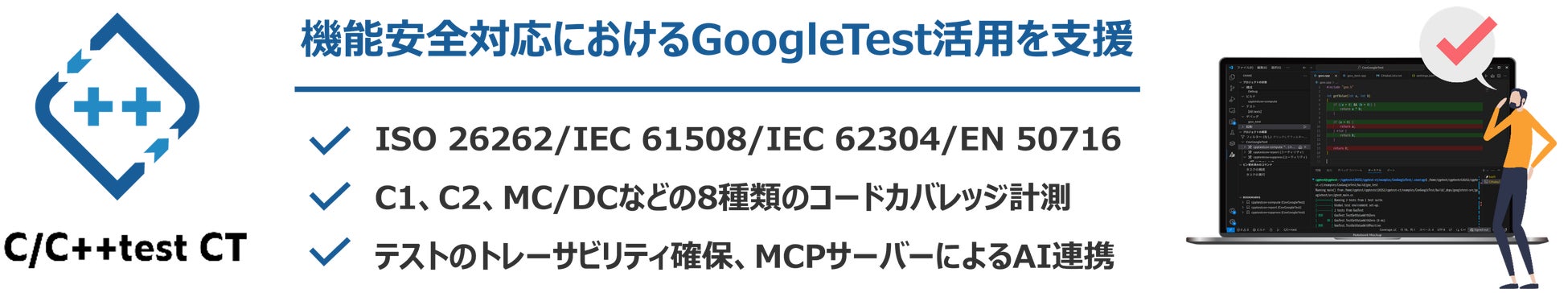 C/C++test CTは自動車、産業機器、医療機器などのセーフティ・セキュリティクリティカルなソフトウェア開発におけるGoogleTestの活用を支援します。ユニットテストにおける「コードカバレッジ計測」、「トレーサビリティ確保」などの機能により、機能安全規格への効率的な対応を可能にします。また、C/C++test CTはGoogleTestをパッケージとして含み、ソリューション全体として第三者認証機関であるTÜV SÜD社よりツール認証済みであるため、C/C++test CTおよびパッケージしているGoogleTestの「動作の安全性・信頼性」が保証されています。さらに、AI連携機能としてMCP(Model Context Protocol)サーバーを搭載しており、AIエージェントと連携したスムーズなツール利用を実現します。