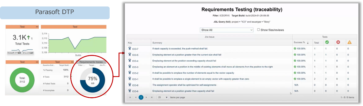 GoogleTest単独ではテスト結果を管理することや、要件とテストを関連付けて管理することはできません。C/C++test CTを用いてテストしたGoogleTestのテストケースは、テスト結果とカバレッジ結果を付属ツールのParasoft DTP上で管理・集計します。日々の開発におけるテストやカバレッジの推移が確認できるとともに、Parasoft DTPを経由してALMツールのテスト要件と、GoogleTestのテストケースを関連付け、要件のテスト実施状況のモニタリングが可能です。機能安全規格で求められる要件とテストケースの双方向トレーサビリティをC/C++test CTとParasoft DTP、ALMツールで実現できます。これにより、開発成果物を相互にリンクすることでトレーサビリティ管理を可視化し、変更管理の効率化、品質向上、問題の早期解決を支援します。