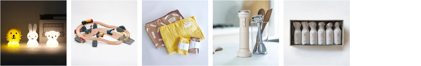 コンセプト:愛しのベイベーが産まれたあの人に贈る、ちょっと豪華な出産祝いギフト。家の中をナチュラルな成分と香りで整える上質な洗剤セット、離乳食の必需品・コードレスハンディブレンダー、夜中にちょっとだけ明かりをつけたいときの可愛いミニライト、おくるみにも毛布にもなるガーゼのブランケットなど、子育てで