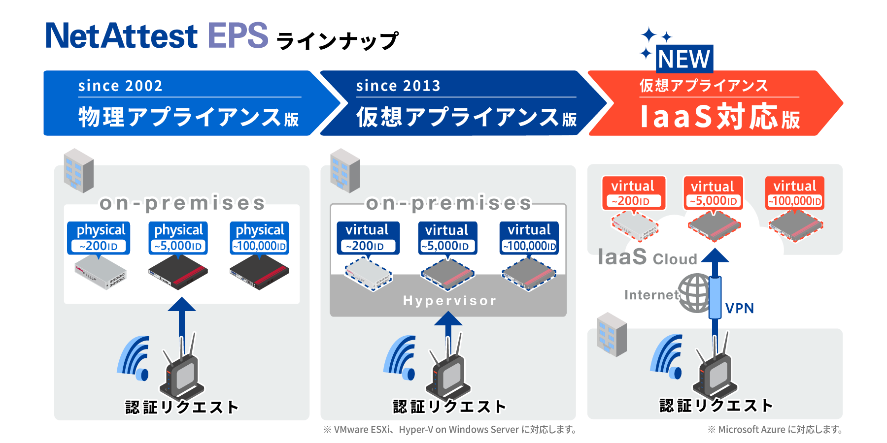 また、NetAttest EPSは、2002年に物理アプライアンスとしてリリースして以降、時代とIT環境の変化に応じて仮想アプライアンス、クラウドサービス(※4)など、最適な形態で提供することで業種や導入規模を問わず多くのお客様から高い評価を受けてきました。