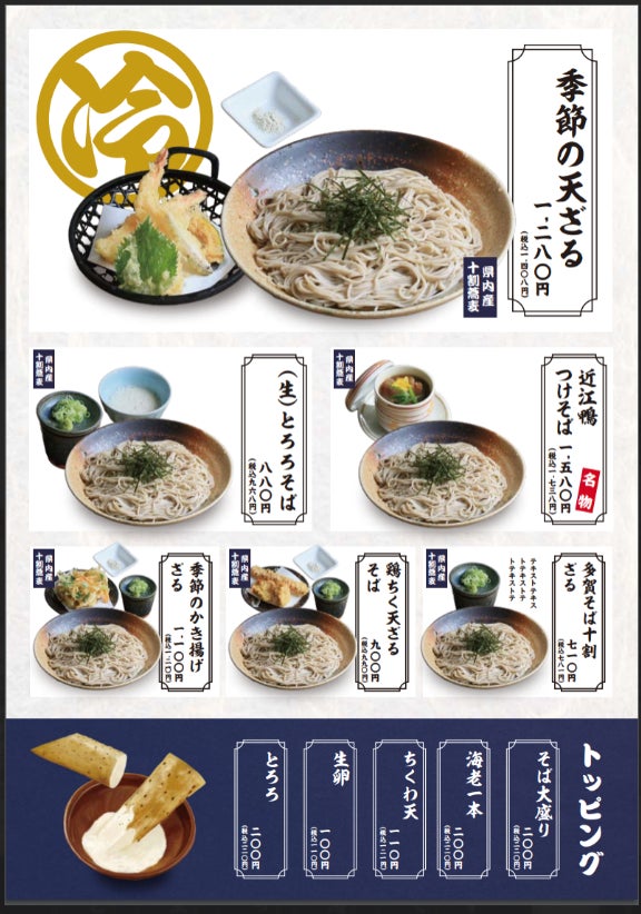 また、地元多賀町産蕎麦粉100%の十割蕎麦の味わいを損なうことがないようにメニューも一新しました。