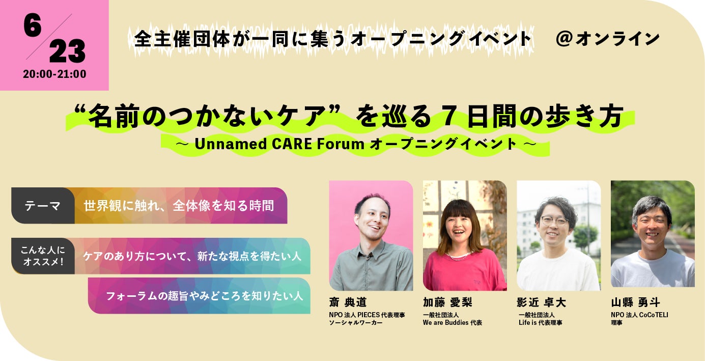 特定非営利活動法人PIECES(本社:東京都文京区、代表理事:斎 典道、以下PIECES)を中心に、「ひとりの人としての関わり」を地域や組織を超えて探究・実践するコンソーシアム「ひびラボ」は、6月23日(月)から29日(日)までの1週間にわたるフォーラム「Unnamed CARE Forum - “名前のつかないケア”を巡る7日間-」を開催します。