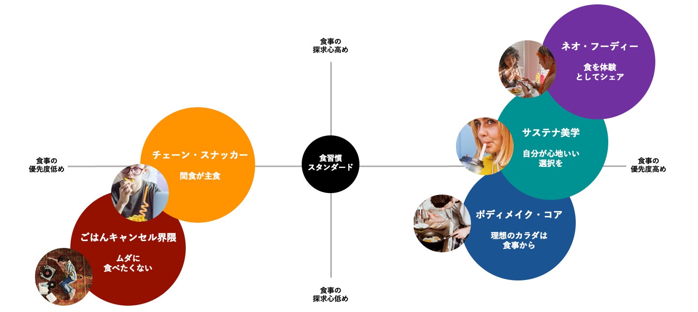 調査で見えた5つの食習慣(ネオ・フーディー、ごはんキャンセル界隈、ボディメイク・コア、サステナ美学、チェーン・スナッカー)の特徴とは?