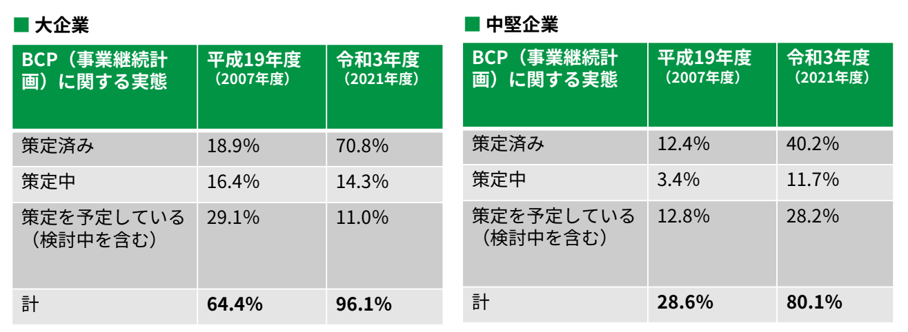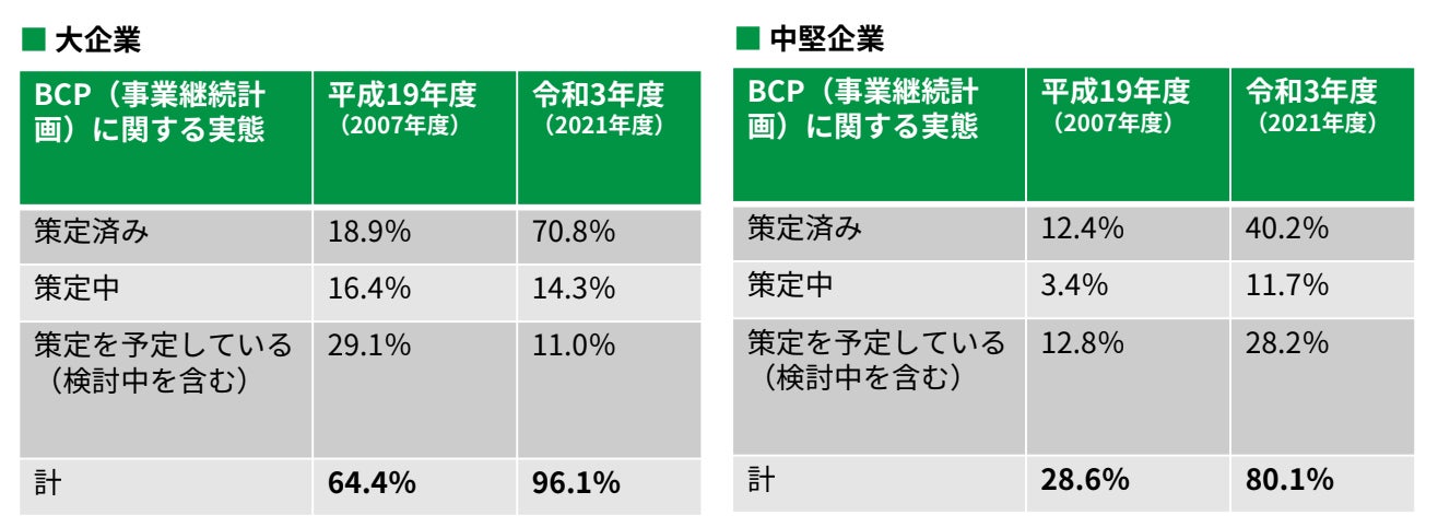 平成19年度と比べて、大企業では70.8%、中小企業では40.2%が策定済みとしており、防災意識についての高まりがうかがえます。