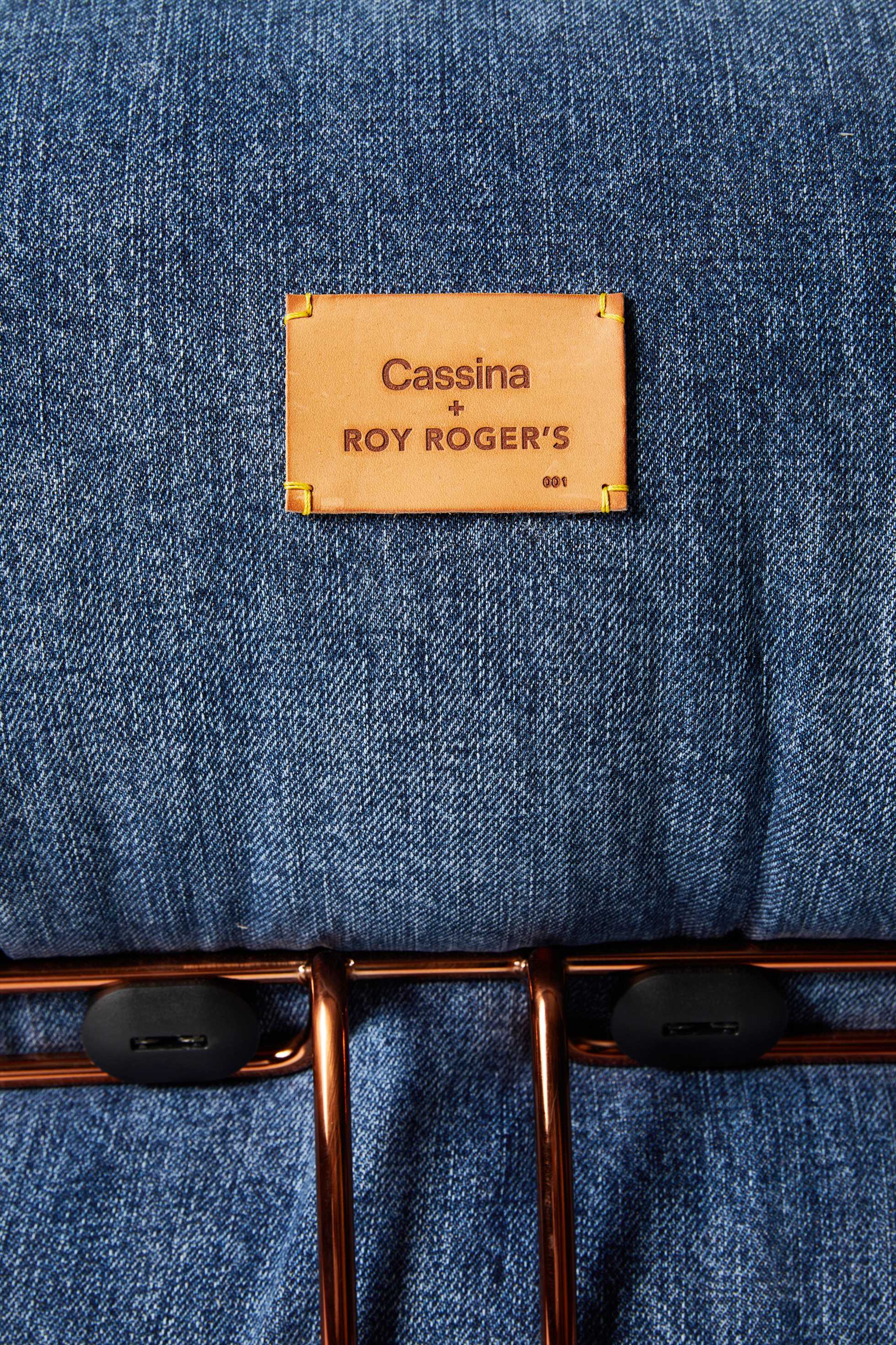 ストーンウォッシュの効果や手作業で施されたダメージ加工が、ソファのギャザーに沿って自然に広がり、デザインを際立たせています。5ポケットジーンズのリベットを想起させるコッパー色のフレームは、この製品だけの特別限定色です。カッシーナとロイ・ロジャース(Cassina + Roy Roger's)のロゴ、1から50までの製造番号がホットスタンプされたエイジドレザータグが縫い付けられており、ロイ・ロジャースのアイコニックなジッパーポケットが付属しています。