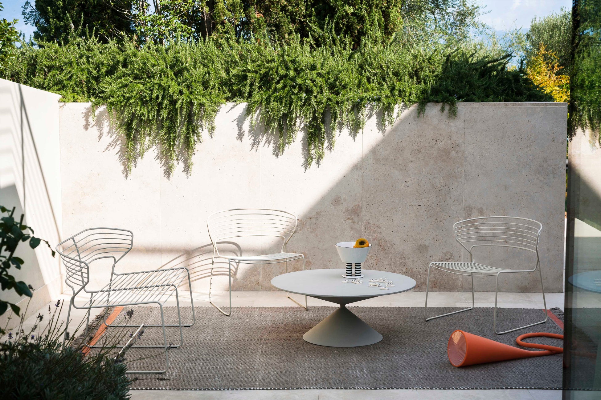 屋外用としてデザインされていますが、屋内でも空間に軽やかな雰囲気をもたらし、オプションのポリウレタン製シートが快適な座り心地を与えます。フォルム、機能、革新性のバランスがとれた、どの視点から見ても魅力的なデザインです。