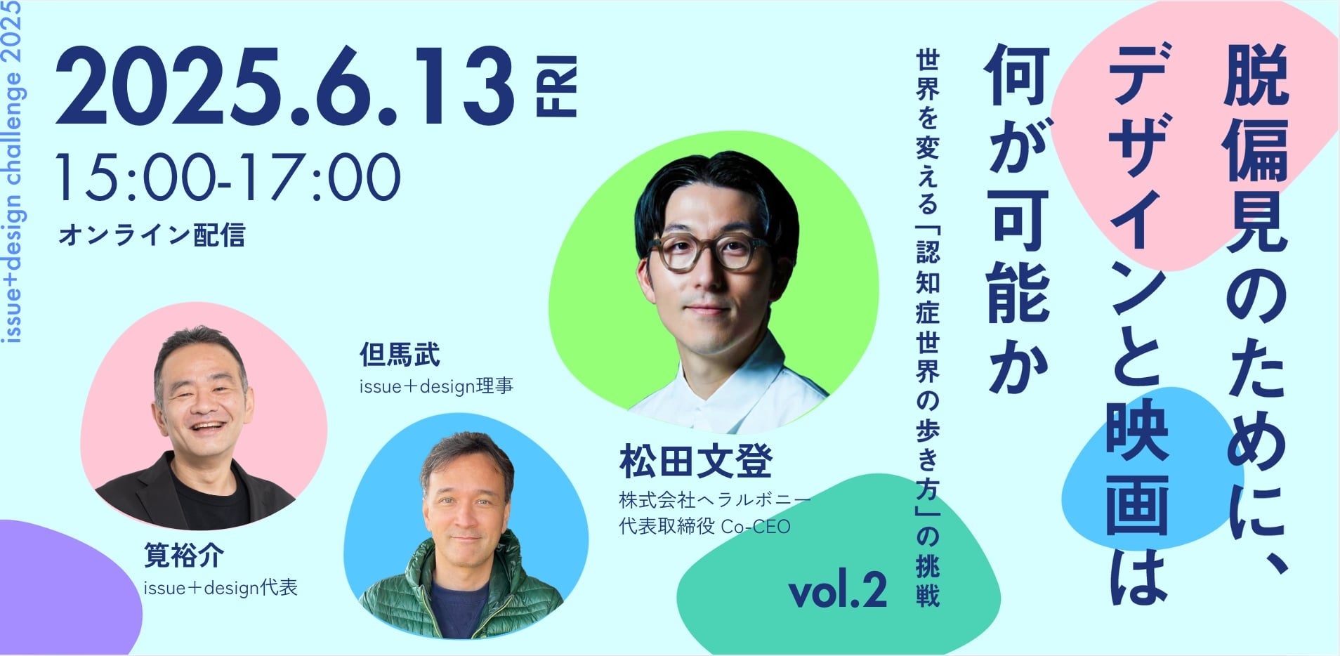 本イベントシリーズ「issue+design challenge 2025 脱偏見のために、デザインと映画は何が可能か」は、さまざまなフィールドで「脱偏見」に挑戦しているゲストをお招きし、認知症に関する偏見を乗り越え、より豊かな社会的理解を生み出すことを目的としたプロジェクトの一環です。