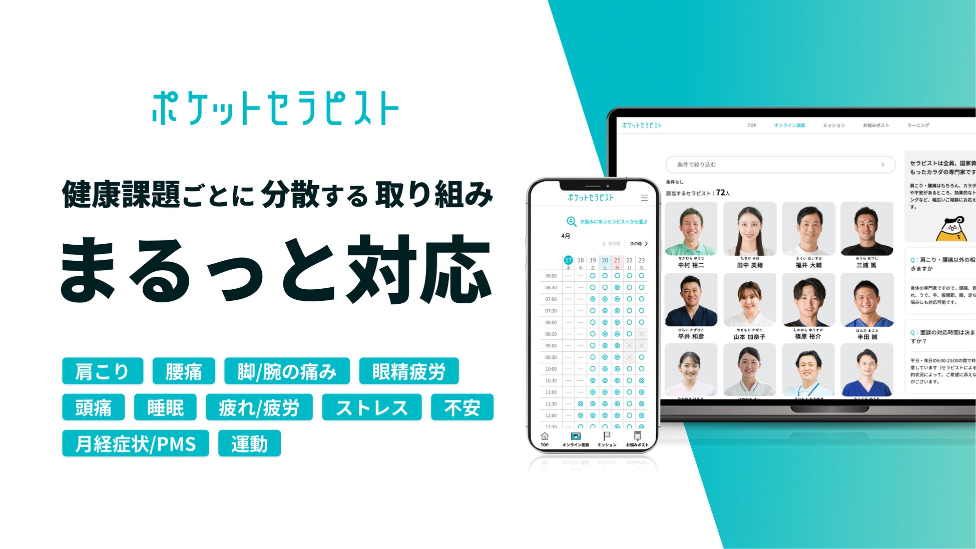 ポケットセラピストは、「対策が難しい企業のメンタルヘルス対策に身体の痛みや悩みからアプローチ」するサービスであり、高ストレス者が抱える傾向が強い身体愁訴からメンタルヘルス不調まで幅広く対策することができます。理学療法士や作業療法士といった医療専門職の知見を元に、従業員1人1人にあったプログラムの提供を通じて、ヘルスリテラシーの向上やセルフケアの習慣化を支援します。健康相談窓口としての機能だけではなく、具体的な不調やお悩みに伴走することで、企業内で近年増加傾向にある高ストレス者への対策やプレゼンティーズムの低減を目的に、業種や企業規模関わらず、数多くの企業に導入が進んでいます。