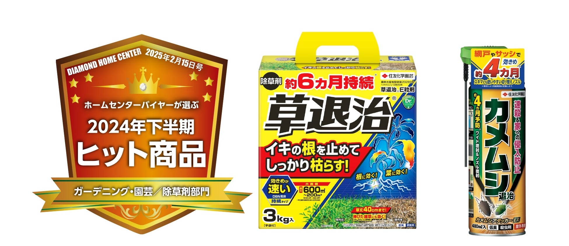 家庭園芸用薬品・肥料等を製造販売する住友化学園芸株式会社(本社:東京都中央区/代表取締役社長:梅田公利)の除草剤「草退治®シリーズ」ならびに不快害虫用殺虫剤「カメムシアタッカーEX」がダイヤモンド・ホームセンター誌「ホームセンターバイヤーが選ぶ2024年下半期ヒット商品」に選出、表彰されました。本企画は、ホームセンターの店頭で業績に貢献度の高かった新商品におけるアンケート評価であり、同品はブランド力、新規機能性、売場提案力などを高く評価されました。