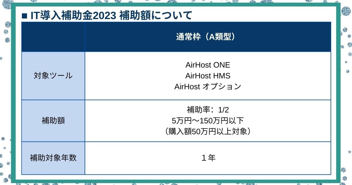 スピードチェックインと充実サービスを届ける宿泊者向けアプリ「AirHost ONE」、オールインワン型のホテルシステム「AirHost HMS」に含まれるサイトコントローラ、PMS、ブッキングエンジン、その他のオプション機能等、「通常枠(A類型)」の対象ツールとなっており、最大補助額150万円を受け取れます。エアホストを初めて導入される宿泊施設様(年間利用料 50万円以上)を対象に、今年度のIT導入補助金を利用できます。