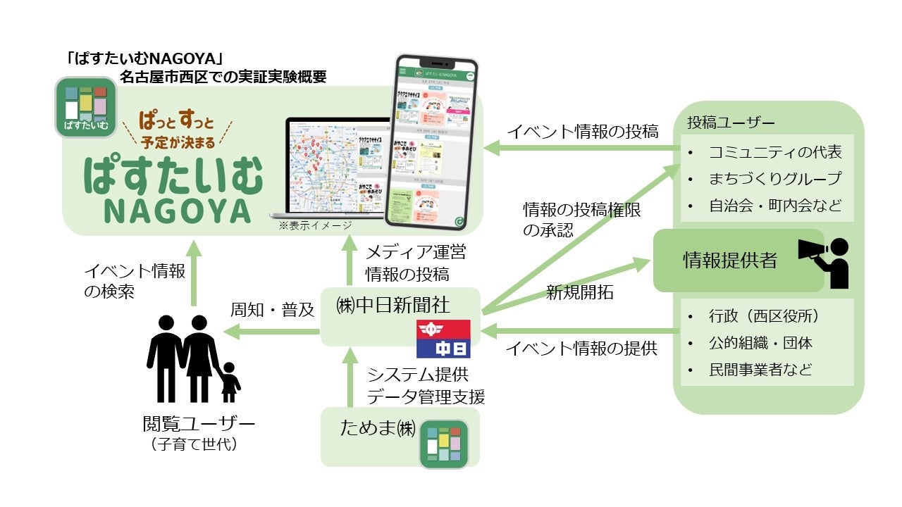 「ぱすたいむNAGOYA」は、インターネット上にあふれる膨大な情報の中から、ご近所のイベント情報を見つけるのが難しいという課題を解決するためにつくられた地域メディアです。閲覧ユーザーは日常の行動範囲に合わせて、地域情報をほしいときに簡単に取得できます。今回の実証実験では、子どもとその親を対象とするイベントや、まちづくり活動、祭りといった催しものの情報をお届けします。