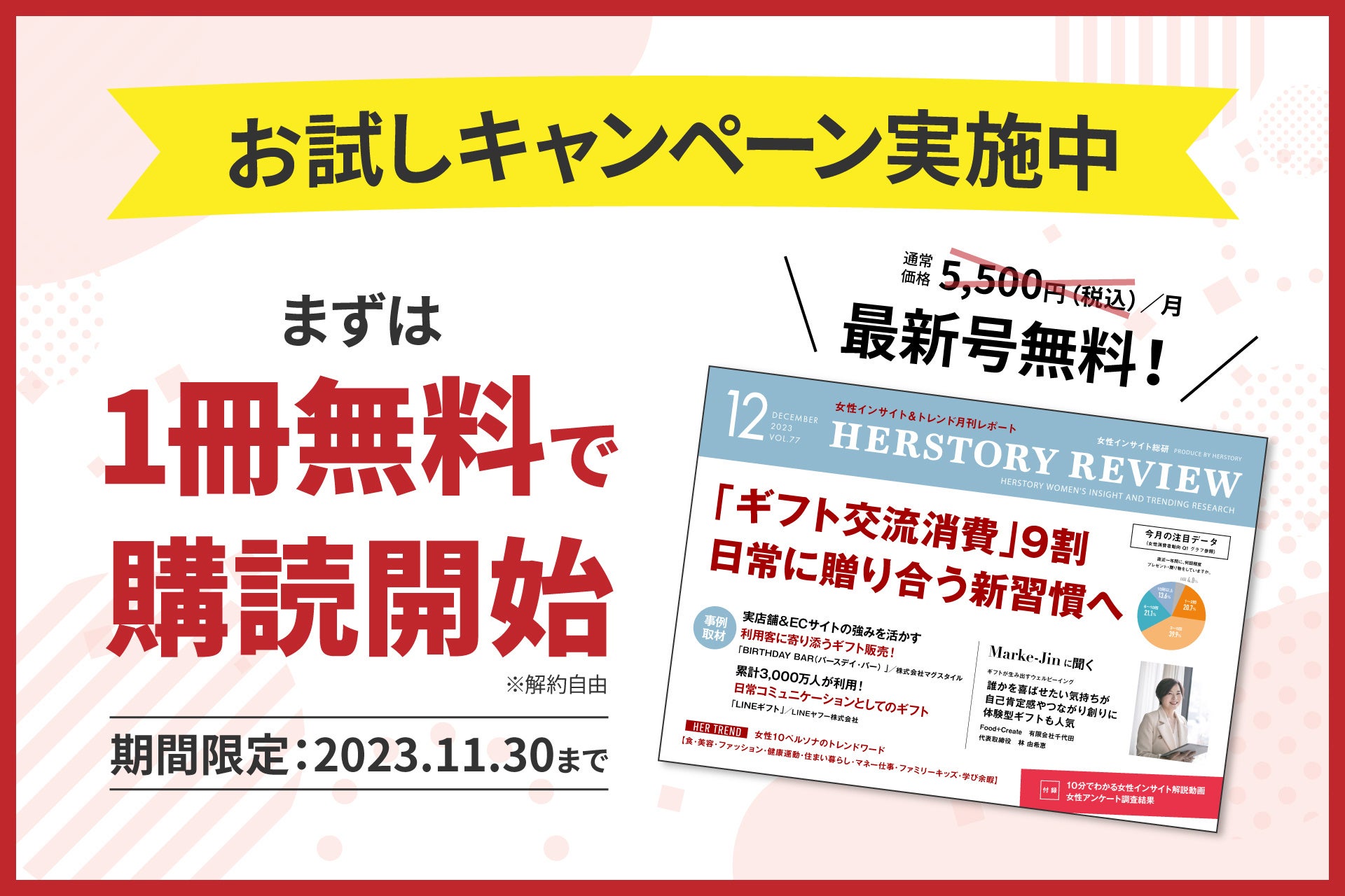 女性インサイト総研が日本女性の消費動向、市場の最新トレンドを毎月追いかけており結果の月刊レポートを展開し各企業のマーケティングに幅広く活用いただいています。本リリースの調査の詳細は12月号のHERSTORY REVIEWをぜひご覧ください。