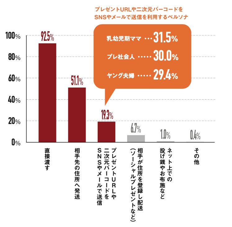 購入場所、贈る方法としてもプレ社会人、ヤング夫婦、乳・幼児期ママはソーシャルやネットを活用した手段をとっていることが分かります。65歳以上のセカンドライフ層では「相手先の住所へ発送」が約7割という結果でした。このことから送り先の住所を簡単に入力・保存できるようなサービスの提供や、スマホやパソコンの操作が不慣れな方向けに、デジタルギフトの受け取り方や送り方をわかりやすく解説したガイドや動画を提供や、何を贈れば良いか悩んでいる方向けに、専門のアドバイザーやAIがギフトの選択をアドバイスしてくれるサービスなどが解決策として有効だと言えそうです。