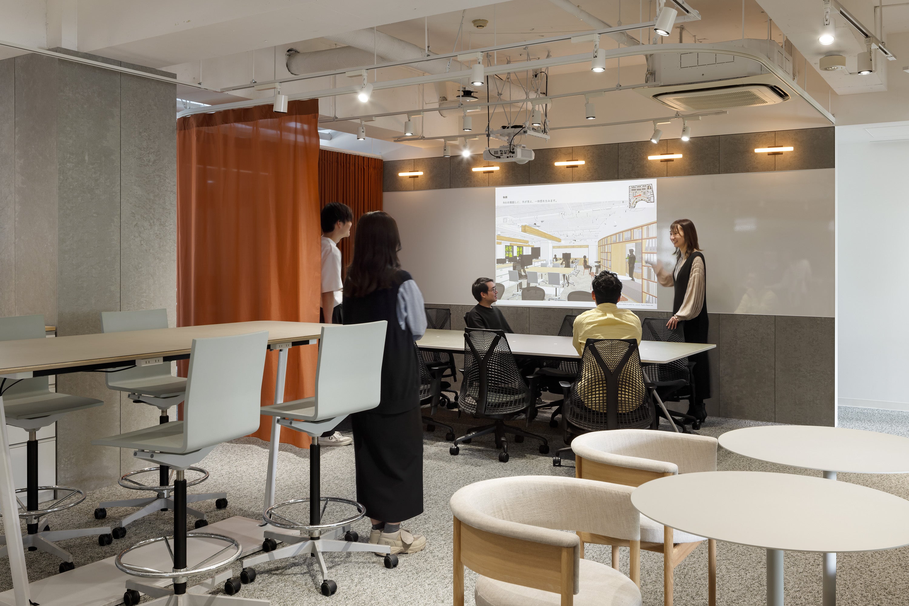 プレゼンの練習やチームでのブレストの場として活用できるアウトプットエリア。人通りの多い入口近くに位置するこのエリアは、通りかかった従業員も気軽にディスカッションに加わることができるような開かれた空間として設計されています。カーテンを閉めて、緩やかに空間を区切ることも可能です。