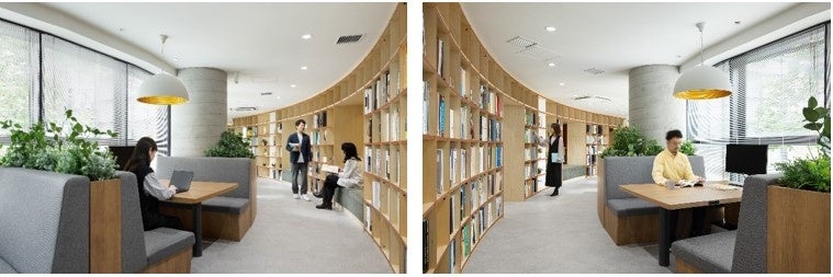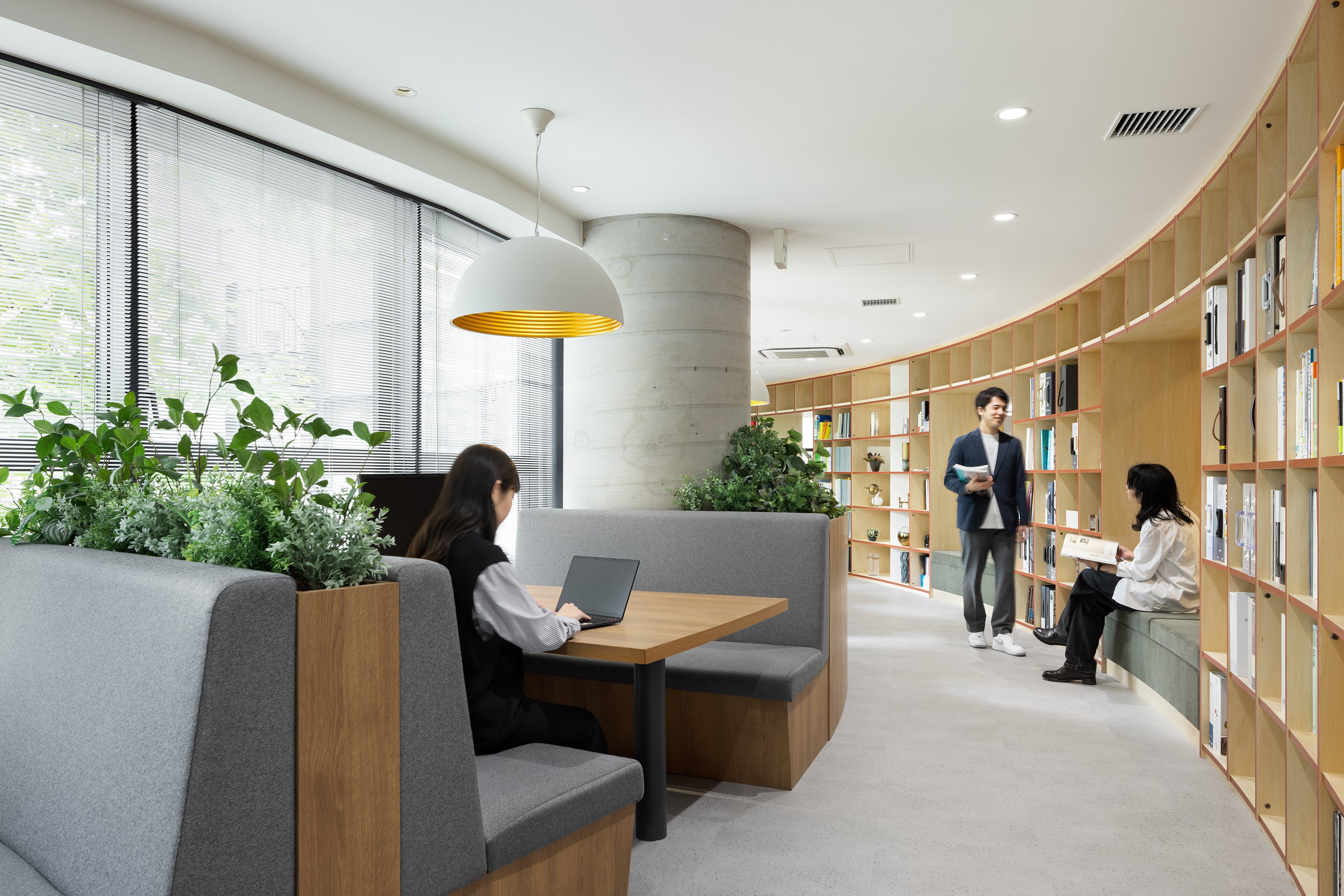 曲線のビルの形状に合わせた円弧状のライブラリー。本棚の合間にある大きな開口は、室内に外光を取り込むだけではなく、他エリアからの視線とお互いの気配を感じることができます。