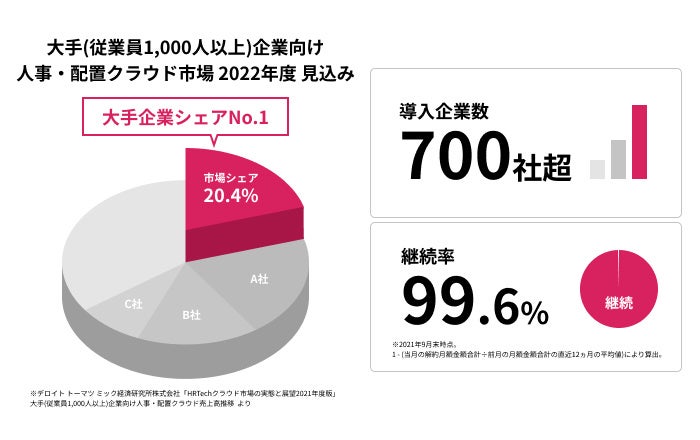 ※上記、市場シェアに関しては、デロイト トーマツ ミック経済研究所株式会社が発行している「HRTechクラウド市場の実態と展望2021年度版」に記載された内容を引用したものです。
