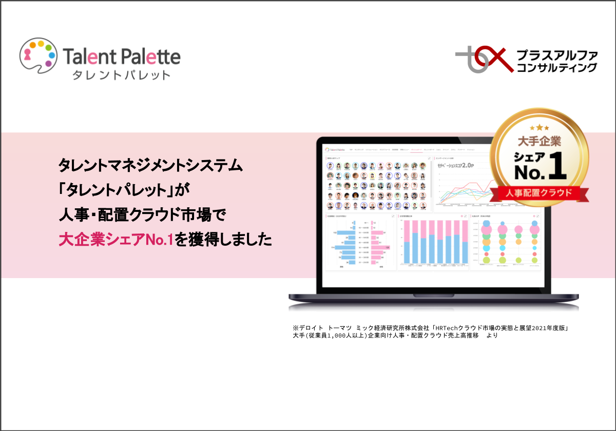 株式会社プラスアルファ・コンサルティング(本社:東京都港区、代表取締役社長:三室克哉、証券コード:4071)が提供するタレントマネジメントシステム「Talent Palette(以下:タレントパレット)」は、デロイト トーマツ ミック経済研究所株式会社(本社:東京都千代田区、代表取締役社長:有賀章)の発行する市場調査レポート「HRTechクラウド市場の実態と展望2021年度版」大手(従業員1,000人以上)企業向け人事・配置クラウド にて、ベンダー別売上金額シェアNo.1を獲得しました。