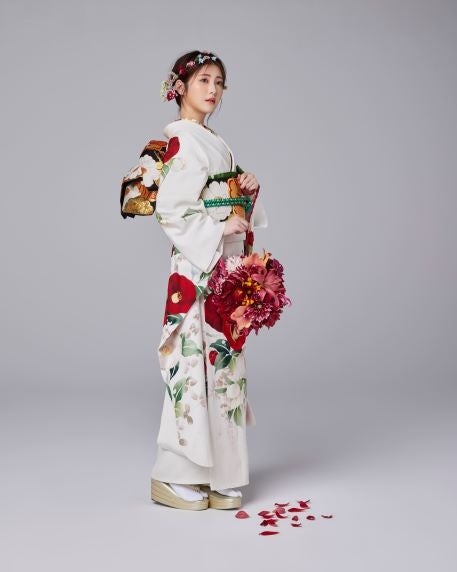 一年中、葉が青いまま春を待つことで演技のよい花とされ「吉祥文様」として古くから愛されてきた椿がテーマの正統派の一着。真っ白で無垢な白の振袖に咲く赤い大きな椿が、初々しくも優雅に仕上がっています。今回のビジュアル撮影では、ヘアを盛りすぎずタイトにまとめ、生花の花冠を合わせることで、奥ゆかしい美しさをプラスしています。