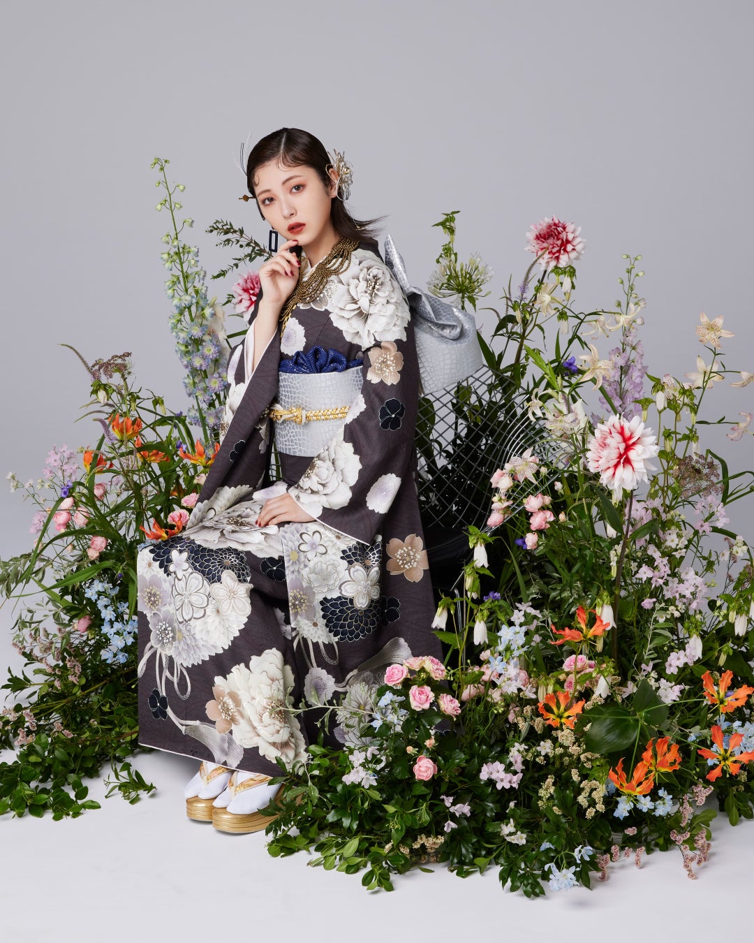細く小さな花弁が見た目も美しく上品な香りをもつ菊の花。日本の国花としても古くから愛され、丸い形がまるで太陽を彷彿とさせることから、位の高い花柄として用いられてきました。シックな地色に白く描かれた菊と牡丹が際立ち、エレガントな印象を与えます。シルバーの帯やゴールドのネックレス、水引などの小物が輝きを放ち、近未来的ですっきりとしたハンサムなスタイルに仕上がっています。